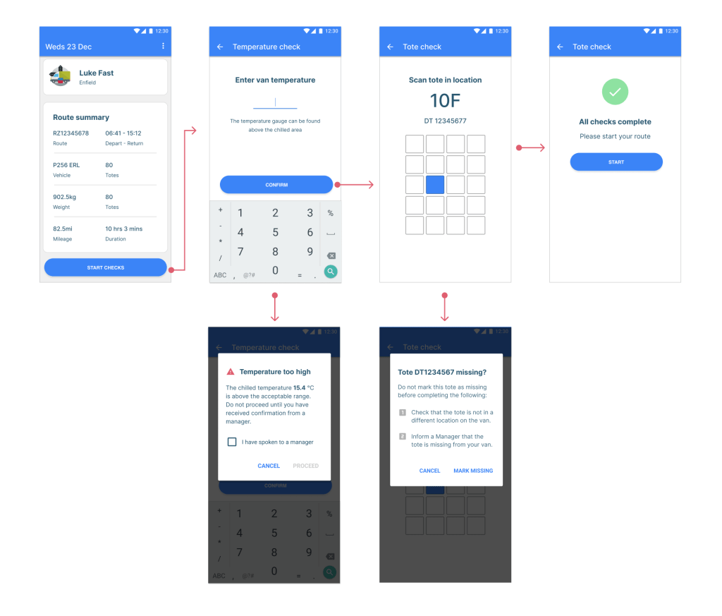 - Improved vehicle and safety checks: The new app introduced detailed inventory verification and required Drivers to manually enter van temperature readings to adhere to food safety protocols and also scanning some barcodes to ensure the correct inventory had been loaded onto the van. Site Managers praised this feature as it ensured Drivers were going through the correct protocols. Drivers were initially hesitant about the additional mandatory steps, but many later expressed appreciation for the added protection it offered. If a van overheated during a route, Drivers could now demonstrate they had followed procedure before departure.