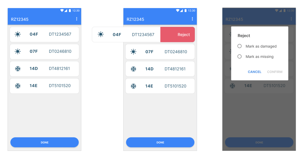 - User friendly workflows: Processes were simplified wherever possible, with clear iconography for quick recognition and common gestures (e.g. swipe to delete) for key actions. Manual text entry was replaced with selectable lists to reduce friction. Additional features were provided to help Drivers quickly identify missing or unknown totes and send SMS messages to customers when running late – saving valuable time during deliveries.